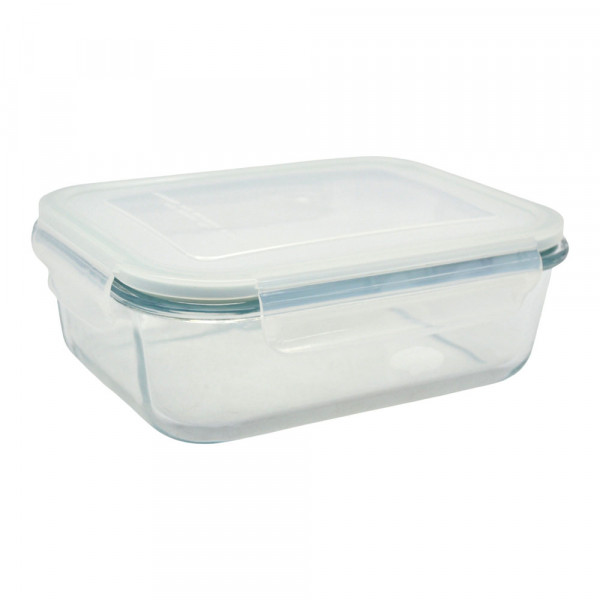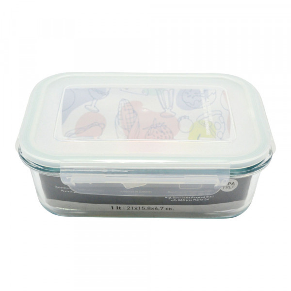 Ορθογώνιο γυάλινο δοχείο τροφίμων 1Lt από πυρίμαχο γυαλί με ανθεκτικό πλαστικό καπάκι για αεροστεγές κλείσιμο. Ιδανικό για αποθήκευση, μεταφορά και μαγείρεμα φαγητού σε φούρνο, μικροκύματα και ψυγείο. Καθαρίζεται εύκολα και προσφέρει πρακτική, υγιεινή λύση για την οργάνωση της κουζίνας.