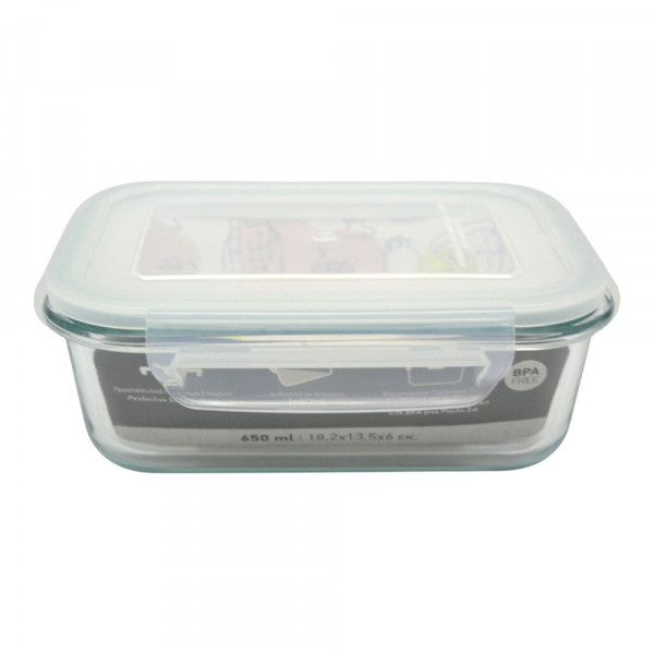Ορθογώνιο γυάλινο δοχείο τροφίμων 650ml από πυρίμαχο γυαλί με ανθεκτικό πλαστικό καπάκι για αεροστεγές κλείσιμο. Ιδανικό για αποθήκευση, μεταφορά και μαγείρεμα φαγητού σε φούρνο, μικροκύματα και ψυγείο. Καθαρίζεται εύκολα και προσφέρει πρακτική, υγιεινή λύση για την οργάνωση της κουζίνας.
